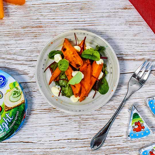 Before I go into this mouthwatering recipe, let me just say one thing: embrace the mess. After all, who can eat nachos elegantly? This moreish twist on a Tex-Mex classic is packed with naturally flavoursome sweet potato rounds thinly sliced instead of plain old shop-bought crisps. Coat these oven-baked crunchy creations with a wonderfully cheesy dressing made from my tangy blue cheese spread, garlic and sour cream. Layer with shredded chicken, chives, tomatoes and sweetcorn and tuck in – you’ll soon see how hard it is to hold back.