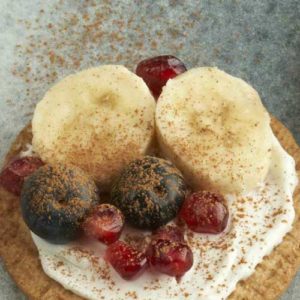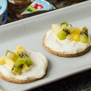 This yummy little number will have you dreaming about a tropical paradise from the first bite. Slather my creamy cheese spread onto some crunchy oatcakes then spoon over a few exotic fruits. I’ve chosen refreshing pineapple and kiwi, but you can top it with whichever fruit floats your boat.